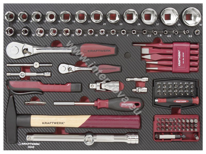 - nářadí je uloženo ve speciálním pěnovém prolisu EVA a v gumách na jednotlivých vložkách nebo ve víku kufru